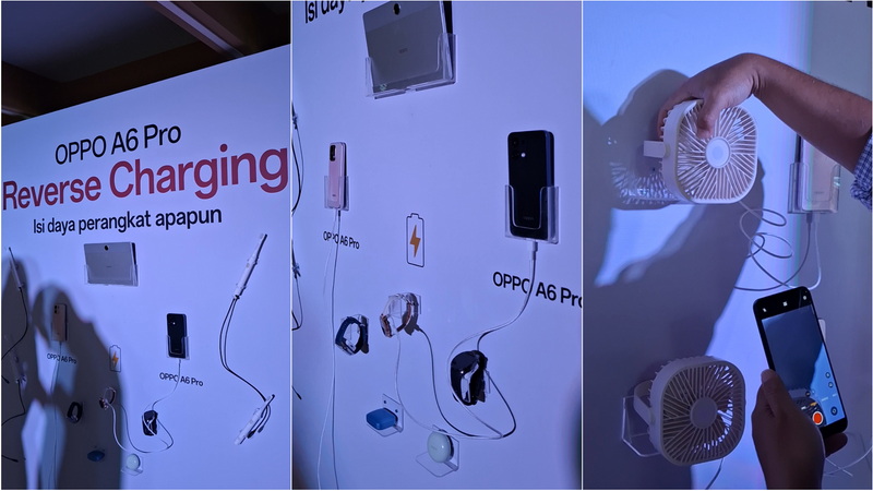 OPPO A6 Pro juga menyematkan fitur reverse wired charging, memungkinkan digunakan sebagai powerbank darurat untuk mengisi daya perangkat lain seperti earphone, smartwatch, kipas portable, bahkan saat peluncurkan ditunjukkan bagaimana baterai ini bisa mengisi daya hingga blender mini.