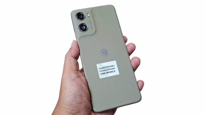 Di bagian tengah bodi belakang, terdapat logo Motorola yang menjadi identitas khas tanpa mengganggu tampilan keseluruhan. Modul kamera belakang disusun secara vertikal di pojok kiri atas, memuat dua lensa dan LED flash dalam bingkai persegi panjang yang tidak terlalu menonjol.
