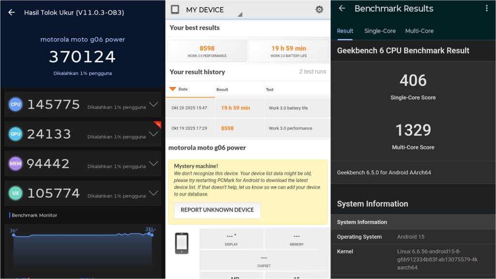 Dalam pengujian penggunaan harian, moto g 06 POWER mampu menangani multitasking ringan dengan cukup baik, meskipun keterbatasan RAM 4 GB membuatnya kurang ideal untuk aplikasi berat atau multitasking intensif.