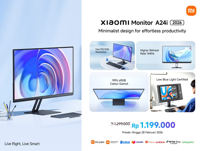 • Xiaomi Monitor A24i 2026: Rp 1.299.000 (promo Rp 1.199.000 hingga 28 Februari 2026)