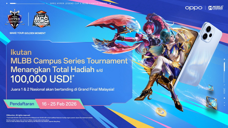 OPPO bersama Mobile Legends: Bang Bang (MLBB) kembali menghadirkan kompetisi esports kampus terbesar di Asia Tenggara, OPPO Hyper Legend Cup x MLBB Campus Series 2026. Turnamen ini menjadi ajang bergengsi bagi mahasiswa Indonesia untuk menunjukkan kemampuan terbaik mereka sekaligus bersaing dengan tim dari Malaysia, Singapura, dan Filipina. Dengan total hadiah mencapai USD 100.000, kompetisi ini siap melahirkan generasi juara baru di kancah regional.