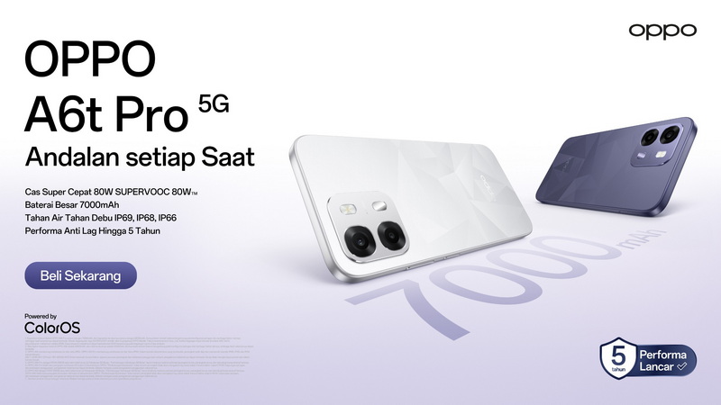 OPPO A6t Pro 5G hadir dengan desain modern dalam pilihan warna Putih dan Ungu, berdimensi 166,61mm × 78,51mm × 8,61mm dengan bobot 216 gram. Perangkat ini sudah tersedia eksklusif secara daring di OPPO Online Store serta e-commerce populer seperti Shopee, TikTok Shop, Lazada, Blibli, dan Tokopedia dengan harga resmi Rp4.699.000. Konsumen juga bisa menikmati promo menarik saat periode gajian atau tanggal kembar di e-commerce.