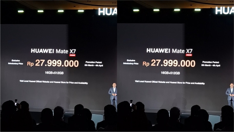 HUAWEI Mate X7 tersedia dalam warna White Brocade, Nebula Red, dan Black dengan harga resmi Rp27.999.000. Selama periode launching 5 Maret–4 April 2026, konsumen berkesempatan mendapatkan hadiah senilai total Rp13,1 juta, termasuk cashback bank hingga Rp5 juta, HUAWEI WATCH GT 5 Pro senilai Rp4 juta, trade-in cashback Rp1,5 juta, screen insurance Rp2,6 juta, serta cashback tiket.com Rp300 ribu.