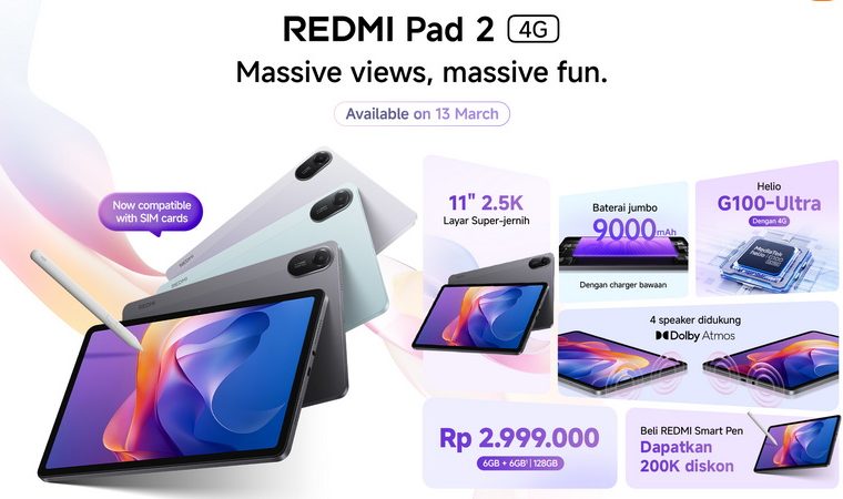Xiaomi Indonesia resmi menghadirkan REDMI Pad 2 4G, tablet pertama dari lini REDMI yang mendukung SIM card. Perangkat ini dirancang untuk mendukung streaming, gaming, hingga produktivitas harian dengan layar besar, performa stabil, dan konektivitas fleksibel.