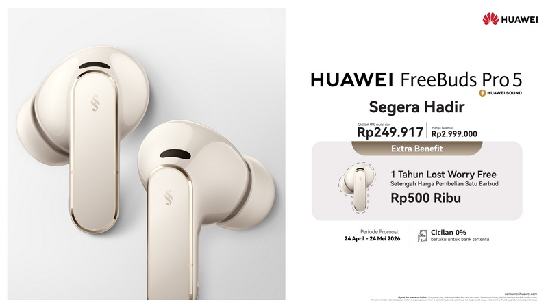 HUAWEI FreeBuds Pro 5 akan tersedia mulai 24 April 2026 dengan harga Rp 2.999.000,-. Konsumen bisa mendapatkannya melalui HUAWEI Official Store di Shopee, Tokopedia, Blibli, TikTok Shop, Lazada, serta mitra ritel offline seperti Erafone dan Urban Republic. Selama periode promosi 24 April – 24 Mei, tersedia penawaran menarik termasuk 1 Tahun Lost Worry Free senilai Rp 500 ribu.