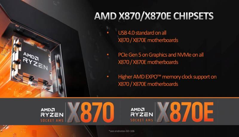 AMD juga memperkenalkan chipset X870 dan X870E baru. Dibandingkan dengan X670 dan X670E, seri X800 dipastikan memiliki USB 4.0 serta PCIe Gen 5 untuk grafis dan SSD. Kecepatan overclocking memori EXPO juga meningkat dari 5200MHz pada Ryzen 7000 menjadi 5600MHz pada Ryzen 9000. Motherboard seri 800 akan mendukung chip Ryzen 7000, dan motherboard seri Ryzen 600 yang ada akan mendukung Ryzen 9000 dengan update BIOS.