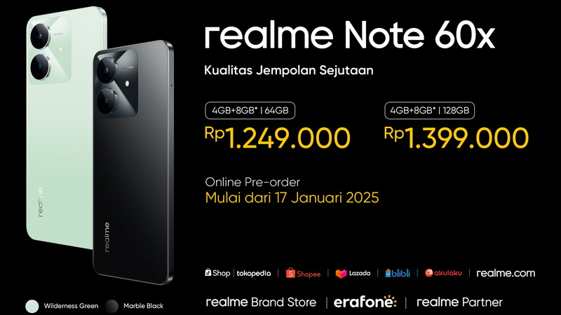 realme kembali meluncurkan smartphone di segmen entry level melalui seri realme Note 60x. Smartphone terjangkau namun tangguh ini hadir dalam dua konfigurasi memori, dengan harga Rp1.249.000 untuk varian 4GB+8GB*|64GB dan Rp1.399.000 untuk 4GB+8GB*|128GB. Keduanya bisa didapatkan melalui pre-order mulai tanggal 17 Januari 2025 di Shopee (4GB+8GB*|64GB) & (4GB+8GB*|128GB), Lazada, TikTok, Tokopedia, akulaku, Blibli, dan realme.com.