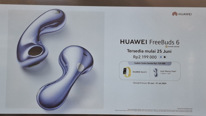 HUAWEI FreeBuds 6 rilis perdana pada 25 Juni 2025 di gerai Huawei Authorized Experience Store, Erafone, Urban Republic, BliBli Offline Store, dan gerai mitra Huawei lainnya. Produk ini juga bisa didapatkan di e-commerce terkemuka Huawei Store, TikTok Shop, Tokopedia, BliBli, Lazada, Eraspace, DataScript Mall.ID, dan Shopee untuk dapatkan penawaran cicilan 0% dengan SpayLater. HUAWEI FreeBuds 6 sendiri dijual dengan harga Rp2.199.000.